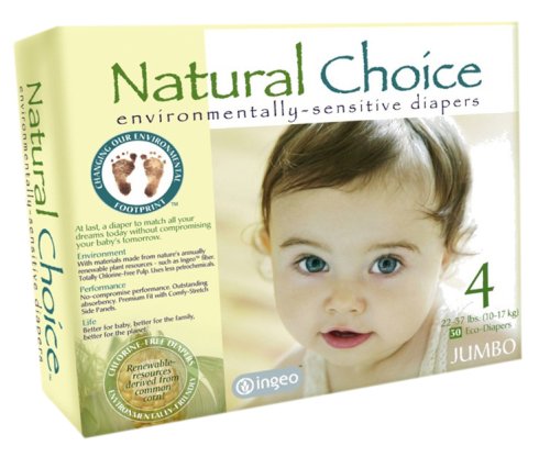Natural Choice diapers take an innovative environmental approach while incorporating super premium diaper quality. Natural Choice diapers respect your baby's skin, perform like a super premium diaper, and offer a competitive price. Like the highest quality premium brands, Natural Choice offers a stretch waist, full-stretch side panels, premium absorbency (with a bio-based absorbent) and a design-printed backsheet. But the environmental impact of Natural Choice diapers is very different from leading national brands. Approximately two-thirds of the materials used in the leading diaper brands are synthetic and are derived from non-renewable resources. The production of these materials consumes valuable petrochemical resources and in some cases creates adverse environmental impacts. Natural Choice Diapers are designed to reduce the environmental footprint created the the production and consumptiono of disposable diapers. Unlike most diapers, the absorbent padding material in Natural Choice diapers is totally Chlorine-Free. Dioxins and organochlorides are not released into the air or water. Natural Choice diapers also use less synthetic gel material in the absorbent core by blending an innovative bio-based absorbent matieral with traditional absorbent gel material. Finally, the backsheet and topsheet of Natural Choice diapers contain 50% plant-starch based Ingeo (TM) fiber, an annually renewable resource.Similar Products