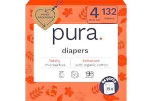 #1:Pura Sensitive Skin Baby Diapers | Size 4 (18-31 lbs) | Hypoallergenic, Totally Chlorine Free, Fragrance Free, Up to 12-Hour Leak Protection | 6 Packs of 22 (132 Diapers)